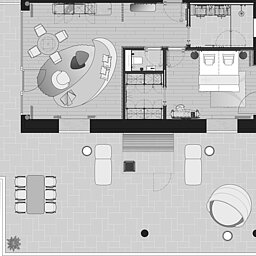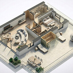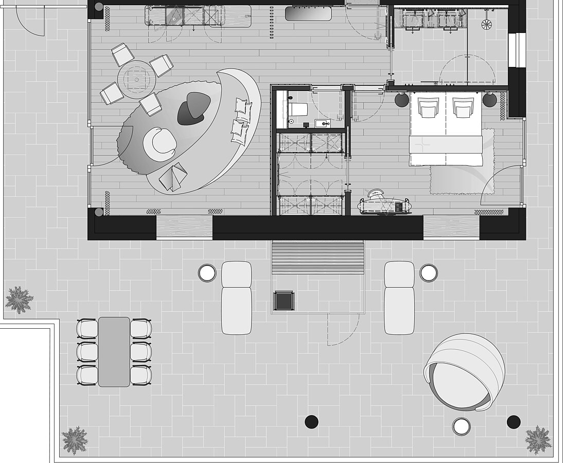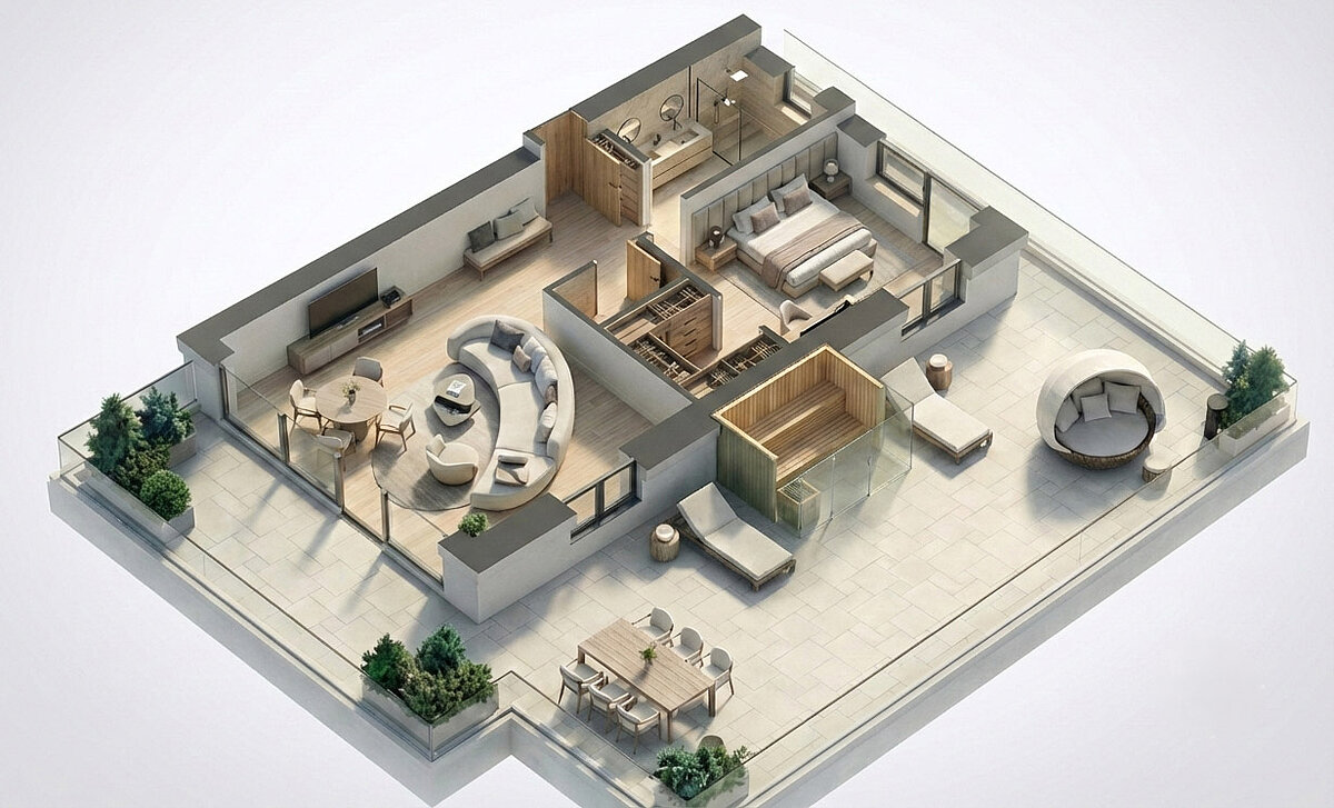 • Große Terrasse (114m²) mit privater Panorama Sauna und Sitz- und Liegemöglichkeit