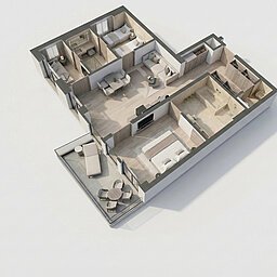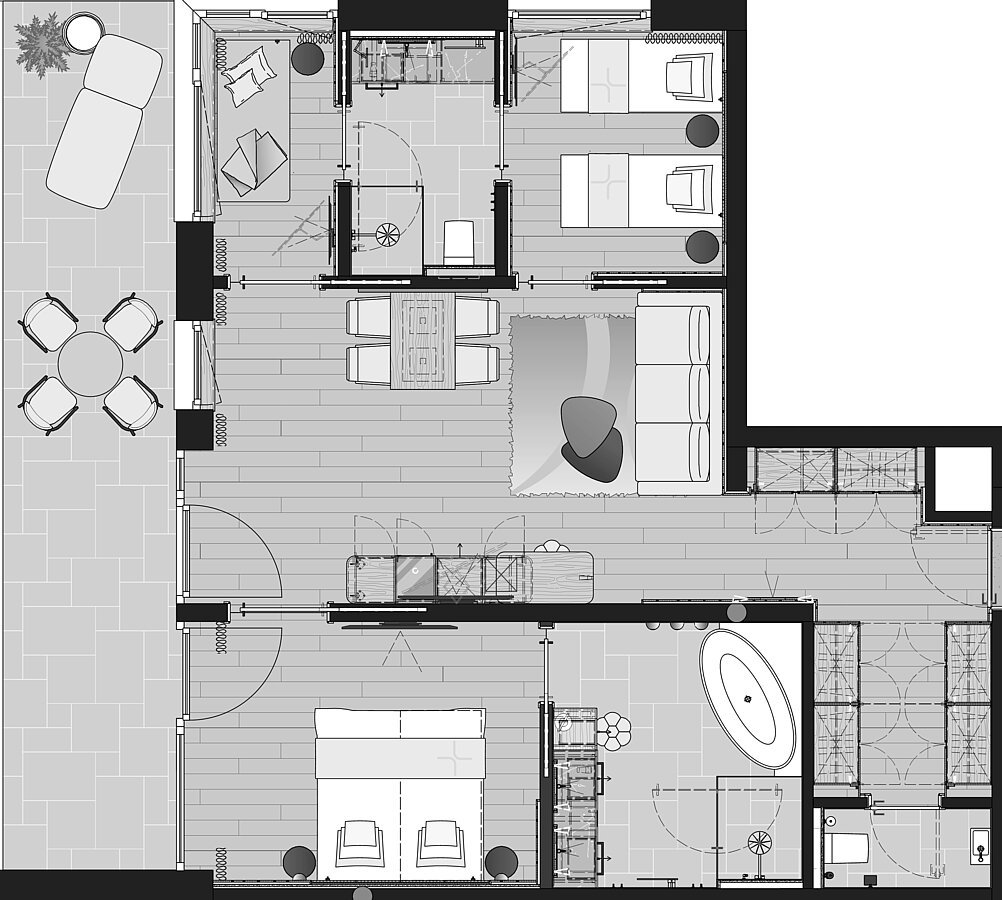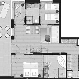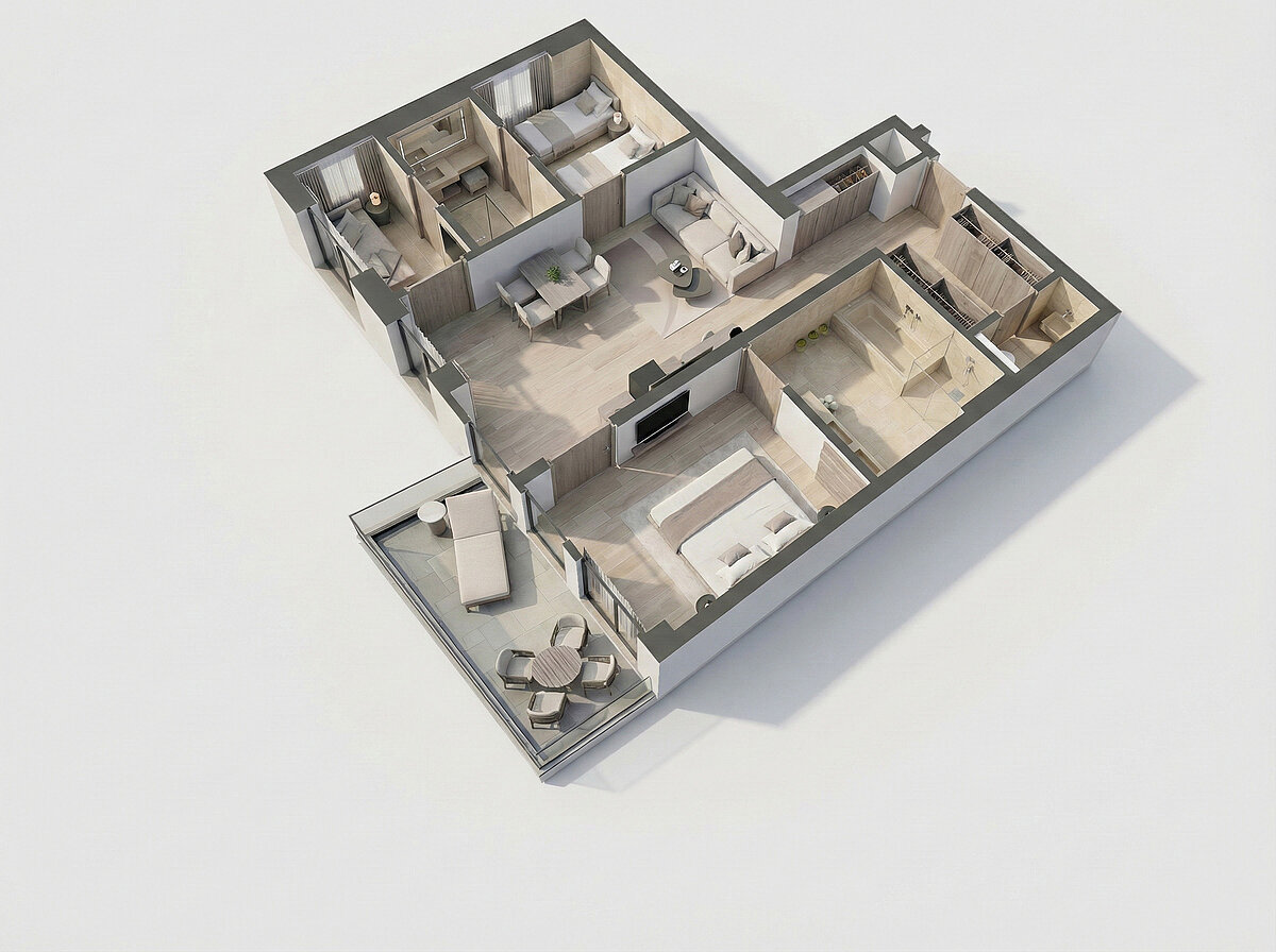 Ein großes Badezimmer mit Doppelwaschbecken, Dusche und Badewanne sowie ein separates Kinderbad mit Waschbecken, Dusche und WC sorgen für hohen Komfort. Der separate Wohnraum mit Couch und Esstisch lädt zum Entspannen ein. Ein 23 m² großer Balkon rundet das Angebot ab.