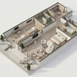 Der offen gestaltete Wohn-Schlafraum vereint Doppelbett, Esstisch und gemütliche Couch und schafft eine angenehme Atmosphäre zum Entspannen. Ein großzügiges Badezimmer mit Doppelwaschbecken, Dusche und Badewanne sowie separatem WC sorgt für zusätzlichen Komfort.