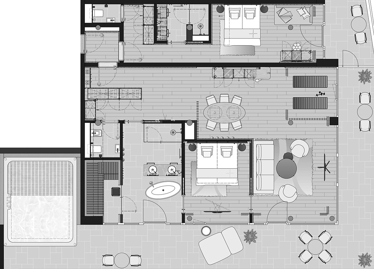 Die Suite verfügt über 2 Schlafzimmer, einen großzügigen Wohnraum mit Esstisch und Couch sowie 2 Bäder mit Dusche, eines davon mit freistehender Badewanne, die komfortables Wohnen für größere Gruppen oder Familien ermöglichen.
