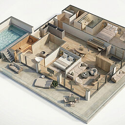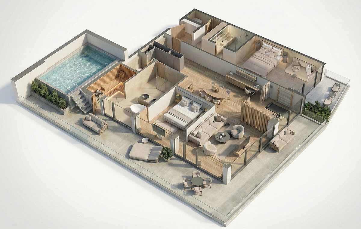 Diese großzügige Luxus-Pool-Suite bietet auf 137 m² Wohnfläche ein außergewöhnliches Wohnerlebnis für 3 bis 7 Personen – ideal für Familien oder Freunde.
